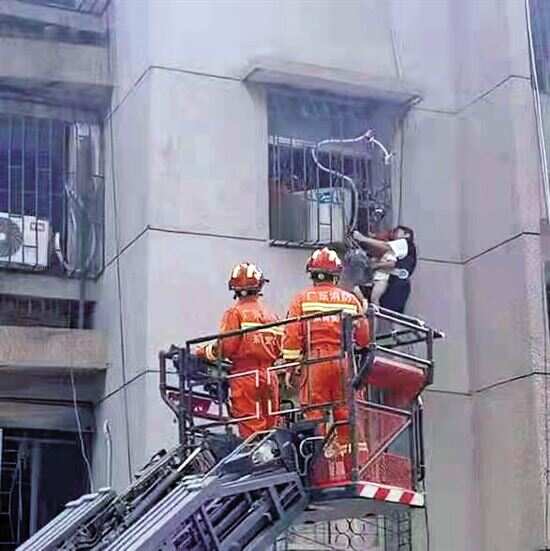 东莞消防紧急救援成功解救 新快报讯 记者杨英杰报道 惊险!7月5日上午,东莞市虎门镇一名3岁男童爬上自家的窗台,头不慎被卡于阳台防盗网上,两脚悬空。母亲发现后,跳至窗户下的水泥平台,屈膝双手托住男童。由于男童母亲没有任何安全保护,极易发生坠落,情况十分紧急。 接警后,东莞市消防救援支队虎门大队火速赶往现场展开救援。救援人员先到达四楼,利用安全绳、安全腰带对母亲进行固定,防止母亲发生坠楼。另一组消防救援人员从里外开展救援,在四楼里面的救援人员利用液压破拆工具对阳台防盗网进行破拆,外面的救援人员利用云梯消防车上升至四楼阳台外,对被困母子进行救援。 经过约十分钟的紧张救援,消防救援人员成功解救被困母子。