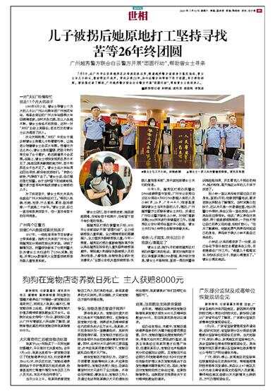 广州越秀警方联合白云警方开展“团圆行动”,帮助曾女士寻亲 7月8日,在广州市公安局越秀区分局流花派出所,随着越秀警方宣读亲子鉴定结论,曾女士与儿子相认,激动得泣不成声。骨肉分离26年,如今