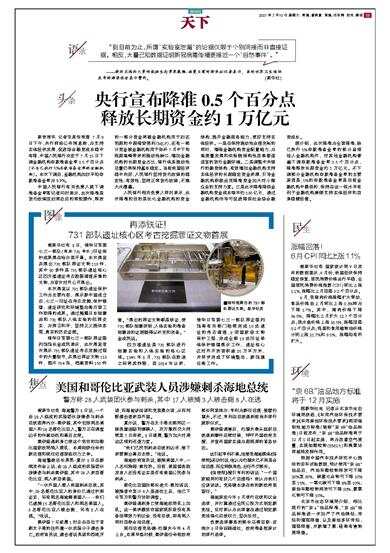 头条 新快报讯 记者范昊怡报道 7月9日下午,央行网站公布消息称,为支持实体经济发展,促进综合融资成本稳中有降,中国人民银行决定于7月15日下调金融机构存款准备金率0.5个百分点(不含已执
