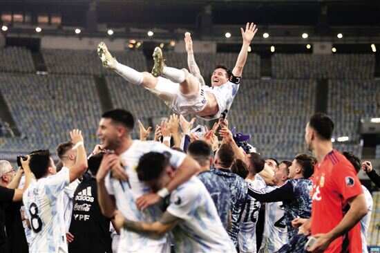 北京时间昨天上午,美洲杯决赛在里约热内卢马拉卡纳球场打响。凭借迪马利亚的进球,阿根廷队在客场1∶0战胜了巴西队。时隔28年,阿根廷队再次赢得了美洲杯冠军,而这也是阿根廷队长梅西在国家队的第一个冠军。就在美洲杯决赛开打之前,南美足联做出了一个意外的决定——梅西和内马尔共同当选本届美洲杯最佳球员。MVP可以有两个,但美洲杯却注定不能“双冠军”——梅西率领的阿根廷队最终赢了内马尔领衔的巴西队。 ■新快报记者 王敌 历史一瞬 美洲杯·决赛 巴西 0∶1 阿根廷 梅西获得美洲杯金球奖、金靴奖 据新华社电 2021美洲杯足球赛10日(当地时间)在巴西里约热内卢落下帷幕,阿根廷队不但1:0战胜巴西队夺得冠军,队长梅西还获得金球奖和金靴奖。 梅西还以4个进球与哥伦比亚球员路易斯·迪亚斯共享进球最多的金靴奖。他还贡献了5个助攻。 特写 2021年7月10日晚的马拉卡纳大球场,乌拉圭籍裁判终场哨声吹响时,梅西双膝跪地,双手掩面哭泣,接着队友们跑上来将他高高抛起。终于等到了这一刻!终于身披蓝白战袍拿到了一个冠军头衔! 这是梅西在国家队的第一个冠军。2007年、2015年和2016年,梅西曾三次输掉美洲杯决赛;2014年,梅西还输掉过世界杯决赛。在经历了四次大赛折戟决赛后,梅西终于拿下了在国家队的一个冠军头衔。 ●关键词 “世界上最好的球员” 虽然在俱乐部比赛中获得过无数个冠军,但每逢国家队的大赛,梅西始终无法率领阿根廷国家队夺冠,尽管他早在2005年帮助阿根廷青年队夺得世青赛冠军,3年后又在北京奥运会上带领阿根廷国奥队夺冠,但在成年国家队层面,此前他从未获得过国际大赛金杯。 “悲情”一词经常与梅西相伴,“没有国家队冠军就永远不是世界上最好的球员”的说法不绝于耳,他本人甚至曾在2016年冲击美洲杯冠军又一次失败后放出“退出阿根廷国家队”的狠话。 但最终,他还是割舍不下那身蓝白球衣,还是梦想完成自己的愿望。终于,在代表国家队出场的第156场比赛后,他捧起了一个洲际冠军奖杯,足球最终给了他应有的奖赏。 ●关键词 “梅西的美洲杯” 虽然在决赛中最闪亮的不是梅西,他还错过了一个单刀。但整个美洲杯期间无疑他是阿根廷队甚至所有球队中表现最好的球员,他参加了阿根廷队每一分钟的比赛,为阿根廷队贡献了4个进球5个助攻。赛后也获得了金球奖和金靴奖,巴西媒体都称本届杯赛为“梅西的美洲杯”。 在决赛中射入唯一一球的迪玛利亚说:“这场比赛太难忘了,莱奥(梅西)对我说‘感谢’,我也对他说‘感谢’。他还跟我说,这是一场不能错过的复仇,要赢回在智利、在美国和就在这里的那届世界杯上输掉的,今天我们做到了。” 赛后阿根廷媒体纷纷将这场决赛称作“阿根廷的马拉卡纳打击”,因为作为巴西人的足球圣殿,巴西队仅在1950年时在那里输给过乌拉圭队,并将那次失利称作“马拉卡纳打击”。 ●关键词 “快乐的梅西” 这一次夺冠不但圆了梅西的梦想,对手还是阿根廷队的宿敌巴西队,地点还是在巴西国内,这都更加重了这座奖杯在阿根廷人心中的分量。梅西的家乡罗萨里奥市内的国旗纪念碑上,有灯光投射了阿根廷国旗和梅西的形象。 虽然梅西是阿根廷人,但巴西国内梅西的铁杆球迷不少,以至于内马尔和巴西老帅扎加洛都纷纷批评那些不给巴西加油反而助长对手士气的巴西人。 在世界各地,也有无数梅西的球迷,他们都在为梅西庆祝。曾经在决赛后总是失落神情的梅西,这一次终于被摄影师们拍摄到的是快乐、兴奋和享受。 美洲杯已经拿到,2022世界杯正在走来,34岁的梅西是否还将为一个世界冠军的终极目标继续努力呢?(据新华社电)