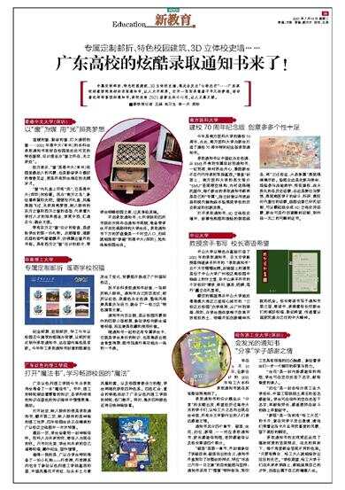 专属定制邮折、特色校园建筑、3D立体校史墙…… 专属定制邮折、特色校园建筑、3D立体校史墙、遇光会发出“七彩光芒”……广东高校相继惊艳亮相的录取通知书,让人大开眼界。打开一张张承载着不平凡