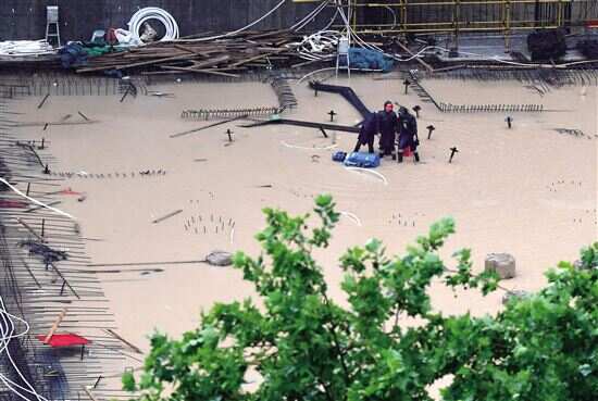 ■工作人员在郑州市一建筑工地排水。新华社发 |