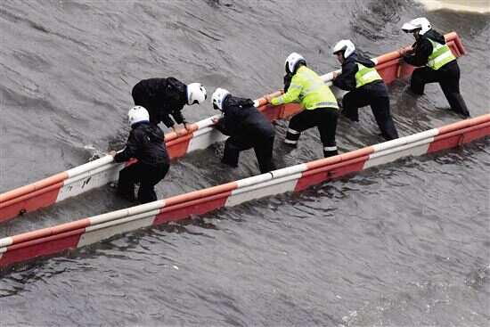 ■7月20日,交通警察在郑州市花园路冒雨修复交通设施。新华社发 |