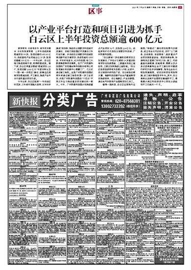 新快报讯 记者李应华 通讯员刘喜冰 白云投促宣报道 上半年完成招商落地项目94宗,投资总额约602.65亿元;完成国有产业用地出让19宗,投资总额超180亿元……今年以来,白云区强力推进招商引