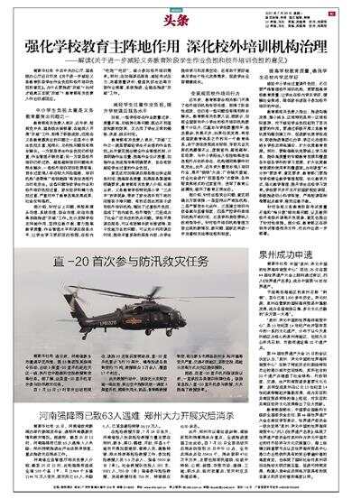 据新华社电 连日来,河南省新乡市遭遇罕见汛情,第83集团军某旅闻令而动,出动3架直-20直升机赶赴灾区一线,执行空中勘察和空投救援物资等任务。据了解,这是直-20直升机首次参与防汛救灾任务。