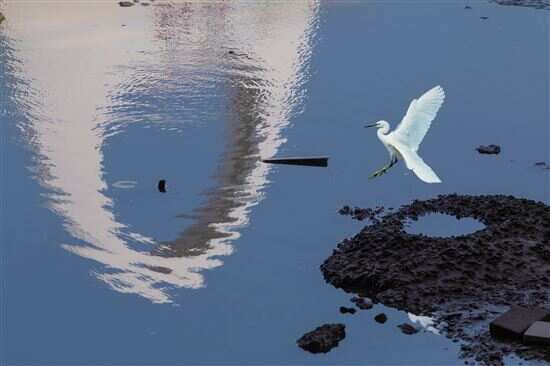 ■白鹭在琶洲大桥下的珠江江面嬉戏。 |