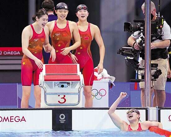 ■7月29日,中国队选手杨浚瑄(左二)、汤慕涵(左三)、张雨霏(左一)和李冰洁庆祝夺冠。新华社发