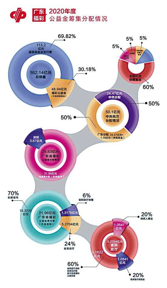 广东福彩发布2020年度社会责任报告 新快报讯 记者记者陆妍思 通讯员莫冠婷 杨端华报道 7月27日,广东省福利彩票发行中心发布《2020年度社会责任报告》(下称《报告》)。这是广东福彩中心自2014年起连续第7年发布社会责任报告。《报告》围绕“落实政治责任、组织治理责任、发行销售责任、非理性购彩行为的预防与干预、员工与零售商责任、政府责任、公众责任、其他社会责任”共8个方面,全面详实地展示了广东省福利彩票社会责任建设工作的实践和成效。 一份答卷: 2020年筹集福彩公益金50.1亿元 《报告》显示,自1987年12月18日在广东销售第一张福利彩票以来,全省福彩系统始终坚持“扶老、助残、救孤、济困”的发行宗旨和“公平、公正、公开、公信”的发行原则,以创新求发展,以规范保安全,走出了一条具有广东特色的福利彩票发展之路。1987年至2020年,广东福彩筹集了福利彩票公益金771.8亿元,用于资助全省各类福利事业项目3万多个,为社会福利和社会公益事业的发展作出了重大贡献。 2020年,广东省共销售福利彩票162.14亿元,筹集福彩公益金50.1亿元(含弃奖),筹集率达30.9%,代扣代缴个人偶然所得税额3.01亿元。 “十三五”期间,全省累计销售福利彩票1039亿元,比“十二五”期间增长127亿元,连续13年夺得全国福彩销售桂冠,保持全国福彩工作领先地位。 一份责任: 坚持防疫复市“两手抓”、防疫销售“双促进” 2020年,受新冠肺炎疫情影响,广东福彩坚持人民至上、生命至上,坚持防疫复市“两手抓”,坚持防疫销售“双促进”,有力克服了疫情冲击等多重不利影响,在特殊环境下全力保障福利彩票从业人员和广大购彩者的身体健康和生命安全,切实维护福利彩票销售工作安全有序进行。 疫情期间,省、市福彩系统精准发力为投注站减负,发放专项疫情补贴合计2768.4万元,全力保障实体渠道稳定。 其中,省福彩中心向全省8892个福彩实体店发放了1778.4万元疫情防控专项补贴,每个站点补贴2000元;广州、汕头、韶关、河源、惠州、东莞、江门、佛山、湛江、清远、潮州等11个市福彩中心,定向站点发放疫情补贴990万元。 随着疫情防控进入常态化,全省福利彩票场所稳步推进有序恢复销售。为鼓舞各地投注站点信心士气、培育队伍竞争力,广东福彩系统开展形式多样的培训和活动。根据中福彩中心要求,制定中国福利彩票双色球销售技能擂台赛广东省配套方案,安排250万配套资金扩大奖励范围,通过“以奖代补,以赛代补” 帮扶站点。此外,2020年7月,组织省、市福彩中心和福彩投注站参加全国福利彩票营销创意系列比赛,广东入围17个优秀作品。其中荣获一等奖2个、二等奖1个、三等奖14个。 一份关切: 积极引导彩民理性购彩 广东福彩倡导“多人少买、寓募于乐、重玩轻博、理性投注”的绿色购彩理念,引导购彩者理性购彩,不断弘扬“公益、慈善、健康、快乐、创新”的福彩文化。 各地销售网点在醒目位置张贴着“理性购彩,量力而行”“警惕非法彩票陷阱,保障彩民自身权益”等公益主题宣传海报、手册等资料,将理性购彩理念植入购彩者心中;此外,广东福彩安排专人每天对全省大额投注情况进行跟踪,做好福利彩票大额投注的监控和干预。 为积极回应社会关切,2020年,福彩服务热线全年累计接听来电咨询6049次。此外,自2013年起,与广东广播电视台共同开办“福彩爱心 社工服务 星空连线”广东社工服务热线,就彩民的疏导、社会关注的特殊群体和热点话题展开访谈;同时开展“大爱有声社工行动”“福彩社工日”“广东社工服务微电影(微视频)大赛”等系列活动,节目至今开播7年,获社会广泛关注及肯定。 2020年国庆节期间,全新开业亮相的福利彩票投注站凭着独特的体验成为广州超级文和友打卡旺地。除了在店面销售彩票外, 福利彩票店还拓展了驻点销售、巡游销售等新颖模式。广州超级文和友是以95后、00后客户群为主的网红打卡点,年轻人在这里感受到了日行一善的快乐。 一份初心: 1.8亿多元支持经济欠发达地区社会福利事业 自发行以来,广东福彩时刻牢记福彩公益慈善初心,始终秉持福利彩票“扶老、助残、救孤、济困”的发行宗旨,积极筹集福彩公益金资助社会福利事业和公益事业,并安排专项福彩公益活动费用开展形式多样的公益活动,让千千万万困难群众走出困境、改变人生,同时为推动社会福利和慈善事业发展、构建“共建、共享、共治”的社会治理新格局作出积极贡献。 福彩公益金实行“收支两条线”管理,分配使用遵循“扶老、助残、救孤、济困”的宗旨,按照科学、合理、公平、公正的原则,统筹考虑区域发展、人口数量、建设规模等因素,确定项目补助标准。2020年,中央和省级彩票公益金合计1.827亿元,用于支持经济欠发达地区社会福利事业。其中,中央彩票公益金安排广东7110万元,支持老年人福利、残疾人福利、儿童福利(孤儿助学)等社会福利事业专项资金3332万元,支持珠海、惠州、云浮市开展居家和社区养老服务改革试点补助资金3778万元;广东安排省级福彩公益金共计1.116亿元,其中补助地市项目资金8532万元、省本级项目资金2628万元,重点用于老年人、残疾人、孤儿、留守及困境儿童、广东社工“双百计划”、救助管理机构设施设备建设、殡葬公共服务设施建设“长青计划”、和谐婚姻建设计划、地名文化建设等