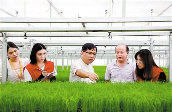 ■阳山农民合作社服务中心工作人员到七拱镇火岗村金穗华晨丝苗米三产融合科技示范基地调研丝苗米科研种植情况。 |