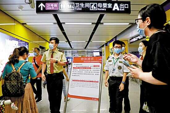 ■员村地铁站内,工作人员对准备乘坐21号线的乘客做换乘指引。 |