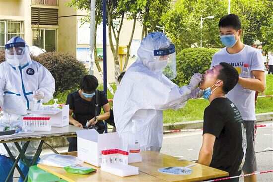 7月30日,重庆市江津区双福街道怡云社区王家湾还房B区的居民在当地政府的组织下有序进行核酸检测。新华社发