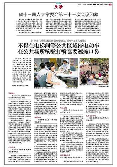 《广东省文明行为促进条例》表决通过,规范十方面文明行为 7月30日,省十三届人大常委会第三十三次会议表决通过的《广东省文明行为促进条例》(下称《条例》),明确了各类文明行为准则,促进文明行