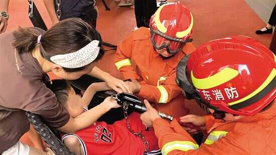 新快报讯 7月24日,东莞高埗镇万科第五城小区儿童游戏区一名5岁儿童在玩荡秋千时手不慎被铁链卡住;8月3日上午,东坑镇新门楼村一名3岁半幼儿因好奇不慎把手指插入塑料椅子圆孔内无法拔出,两起事故中,东莞消防救援人员接警后,都火速赶赴现场暖心解救。 7月24日,高埗一名5岁儿童在玩荡秋千时手不慎被铁链卡住,消防救援人员接警后,立即出动1车6人到场处置。消防救援人员到场后发现小孩左手虎口处卡在秋千铁链上,经向家长了解情况后,随机对秋千进行了查看,然后马上用工具对秋千进行了部分拆卸,并利用电动液压剪将铁链剪短,经过20分钟的紧急救援,小孩的手只受了轻微的皮外伤。 8月3日,东坑一名3岁半幼儿因好奇不慎把手指插入塑料椅子圆孔内无法拔出,消防救援人员接警后,火速赶赴现场。消防救援人员发现幼儿右手食指卡在塑料椅子的圆孔内,被卡手指已经有红肿现象,决定马上开展施救。家长积极配合消防救援人员的工作负责安慰幼儿,舒缓她的紧张害怕情绪,分散其注意力。消防救援人员迅速使用鲤鱼钳稳稳地固定住塑料椅子再用铁剪,小心翼翼地对塑料椅子进行破拆,十分钟后成功把幼儿被卡手指轻轻取出,幼儿的手指并无大碍。(田晓霞)