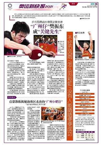 昨天,东京奥运会乒乓球项目的比赛已全部结束。在男子团体的比赛中,派遣马龙、樊振东、许昕三名球员出战的中国队以3∶0的大比分击败了德国队,顺利摘得金牌。这是中国体育代表团在本次奥运会拿到的第35枚金牌,也是“广州仔”樊振东收获的奥运首金。至此,樊振东也成为了首位在奥运会中获得金牌的广州籍男子乒乓球运动员。 ■新快报记者 高京 “广州仔”樊振东 成“关键先生” 乒乓男团战胜德国卫冕金牌 双打速胜打下基础 从2008年北京奥运会开始,乒乓球项目正式设立团体赛,从北京、伦敦、里约到如今的东京,中国队还从未让乒乓球团体的金牌旁落。 昨晚中国男团的对手是强手如云的德国队,该队阵中波尔与奥恰洛夫一直是绝对核心,两人从2008年的北京奥运会开始,一直坚持到了东京。 说起来,波尔今年已是40岁,但他的比赛状态并没有下滑,而奥恰洛夫也是久经沙场,本届比赛他在男单项目上还拿到了一枚铜牌。 正是因为如此,中国男团的三名选手为了决赛做了充分的准备。首场双打的较量,中国队派出马龙、许昕对阵德国队的波尔和弗朗西斯卡。 从比赛过程来看,马龙与许昕的配合明显默契许多,两人并没有给对方机会,很快直落三局,获得了首场比赛的胜利。 有了这场胜利做基础,中国男团在心理层面已稳健了许多。 樊振东逆转奠定胜局 第二场比赛,“广州仔”樊振东迎战奥恰洛夫,这一组对决被认为是本次比赛的关键之战。 首局比赛,樊振东对于奥恰洛夫的反手并不适应,没过多久就以3:11败下阵来。到了第二局,樊振东改变打法,加强了发球和接发球的变化,这使得对方应对起来并不容易。前半段双方一直处于相持状态,当比分来到6:6时,樊振东突然发力,连得5分拿下了这一局。 第三局双方的竞争依旧非常激烈,比分始终紧咬,这一次变成奥恰洛夫在中段发动,这一突然的变化使得德国选手带走了这一局。 第四局比赛开始前,两名球员均更换了球衣,奥沙洛夫利用两个幸运球先得2分,随后樊振东马上还以颜色将比分扳平。正当双方不相上下之时,樊振东打出一拍“神仙球”,瞬间在心理上掌握了主动,随即连拿5分赢下了这一局。 到了决胜局,樊振东抓住了开局,很快便以5:1领先。此时已打出气势的“小胖”乘胜追击,以局分11:3、总比分3:2拿下了这一场比赛的较量。 “比赛中有很多困难,特别是在局分1:2落后的情况下能够顶住压力,完成逆转非常不容易。比赛中那个‘神仙球’起到了重要作用,打完那个球之后他就找到了比赛的节奏。”此前在伟伦体育运动学校带训樊振东的教练员罗绍伦表示。 第三场比赛,中国队派出马龙迎战德国队老将波尔,马龙3:1胜,中国队拿到了这枚金牌。 现场直击 启蒙教练揭秘海珠区走出的“广州小肥仔” “他只是非常结实,样子可爱” 1997年1月樊振东生于广州。5岁时,妈妈带着他在海珠区少年宫接触乒乓球。凭借着自身的努力和刻苦,当他在同福中路第一小学读书时,就已进入伟伦体育运动学校接受系统的乒乓球训练。 “刚来的时候,他给我的感觉就是稳健、听话、自觉。”樊振东在伟伦体校的老师张敏表示。 到了2008年时,11岁的樊振东被八一队选中,继续自己的乒乓球生涯。3年过后,他如愿进入国家队。 2012年,樊振东第一次参加世界级乒乓球比赛,随即拿到了世青赛的男单、男团和混双冠军。此后,樊振东一发不可收。2015年他与队友一同获得迪拜世界杯男团的冠军;2016年,他在世界杯中捧起男单桂冠,这是他个人生涯的首个世界三大赛单打冠军。本次东京奥运会,樊振东正式进入中国队阵容,此前他已收获了一枚男单的银牌。 在昨晚广州的观赛现场,伟伦体校带训樊振东的教练员罗绍伦提起当年一段有趣的往事,就是关于樊振东“小胖”这个昵称的由来。“这个称呼是当年在伟伦体校开始叫起来的,因为樊振东小时候长得圆头圆脑,大家就用粤语喊他‘肥仔’,等到了八一队和国家队,大家改称他为‘小胖’。其实他也没有很胖,只是看着比较结实,样子也很可爱。”回忆起此前带训樊振东的日子,罗绍伦百感交集。“那时候他的力量和爆发力就非常出色,为此我们也给他专门制定了一些计划,保证他在比赛中击球的角度、方向和稳定性上都达到最佳。” 看着自己的爱将在本次奥运会拿到1金1银,罗绍伦感到异常的骄傲和自豪:“他第一次参加奥运会男团的决赛,不要说他,就包括我到现在都有点紧张,能够拿下来非常难能可贵。希望以后他能够多向马龙去学习,学习他的积极性和竞技状态。经历了单打比赛后,樊振东在心态上面成熟了许多。希望他早日成为大满贯选手。” 昨日金牌 北京时间昨晚,在东京奥林匹克体育场进行的奥运会田径比赛,结束了女子标枪决赛,中国选手刘诗颖以66米34获得冠军,实现了中国在这个项目上奥运会金牌零的突破。 刘诗颖1993年9月24日生于山东烟台,2005年5月,12岁的刘诗颖被牟平区体校选中,开始了与标枪为伴的训练生涯。2007年7月,刘诗颖被选送到烟台市体校,之后拿到过两届省运会女子标枪冠军。 2019年,刘诗颖获得2019年多哈田径世锦赛上女子标枪银牌。作为世锦赛银牌得主,刘诗颖多次无限接近金牌,这次终于水到渠成。