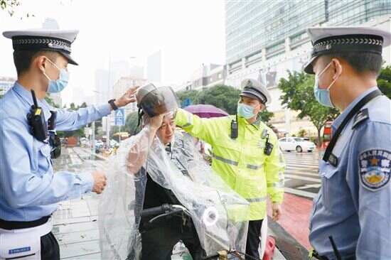 ■天河路体育东路口,交警拦下未佩戴安全头盔的电动自行车车主。 |