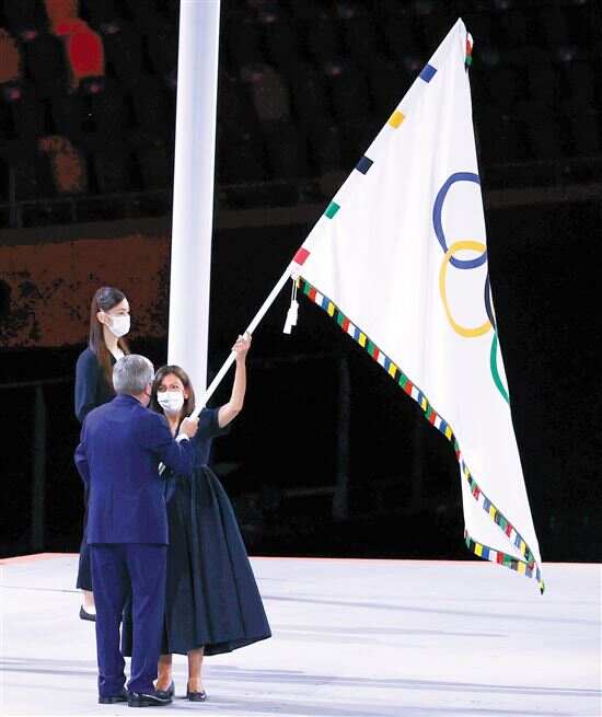 ■国际奥委会主席巴赫和巴黎市长伊达尔戈在闭幕式会旗交接仪式上。 |