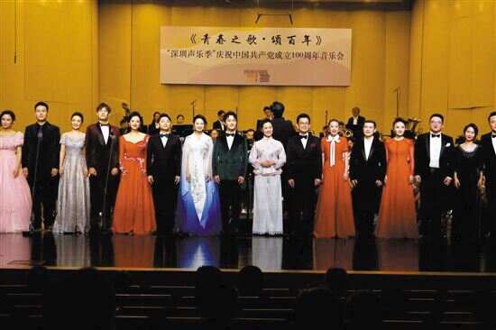新快报讯 记者梁燕芬报道 《青春之歌·颂百年》——“深圳声乐季”庆祝中国共产党成立100周年公益音乐会8月4日在深圳龙岗文化中心大剧院上演。著名歌唱家雷佳携手指挥家林大叶,以及深圳交响乐团与2019-2021三届声乐季的艺术家导师、优秀学员等为观众们呈现了一场艺术盛宴。 “唱支山歌给党听,我把党来比母亲……”本场音乐会在《唱支山歌给党听》的熟悉旋律中开启。随后,《祖国万岁》《永远跟党走》《天边有颗闪亮的星》《英雄赞歌》《我爱你中国》《黄河颂》《我的爱人你可听见》等红色歌曲响彻整个大剧院。而音乐会下半场,在歌曲《阳光路上》《多情的土地》《在希望的田野上》中率先开启,展现出站起来、富起来、强起来的中国一幅勃勃生机的景象。而后,“深圳声乐季”的明星导师石倚洁登场,为观众带来一首深圳词曲作家创作的作品《鼓舞》,将深圳的发展和大湾区的活力也融入其中,掀起了下半场演出的第一个高潮。 紧接着,一首温情的《不忘初心》由刚刚支教回来的声乐季学员熊雄、黄璐、黄晶莹、王晓帆带来。她们不仅奉献了这首温暖的歌曲,也带来了一个感人至深的故事。音乐会尾声,雷佳登台献唱了赞颂美好生活的音乐作品——《我们中国》。最后,在观众热烈的欢呼声中,雷佳、石倚洁携手深圳市各级领导、“中国声乐人才培养计划”优秀学员,共同合唱歌曲《我和我的祖国》,以祝福祖国的歌声将音乐会的气氛燃至最高点。