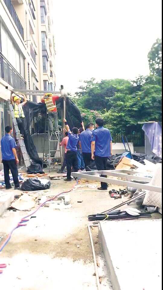 ■白云区金沙街综合行政执法队正在拆除张女士的违建雨棚。 受访者供图 |