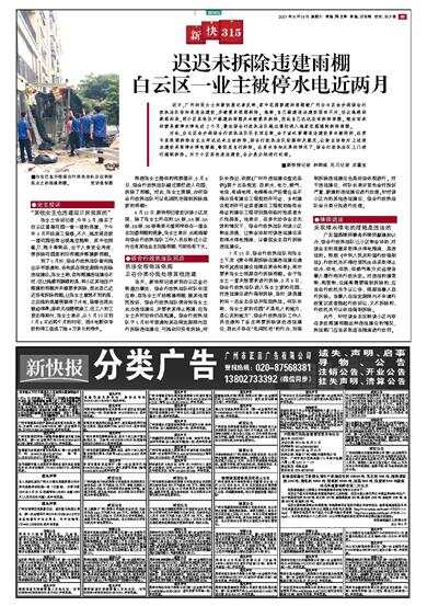 迟迟未拆除违建雨棚 白云区一业主被停水电近两月