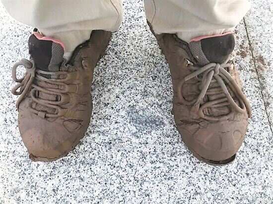 ■考古人员在台风间隙依然争分夺秒工作。图为台风过后,考古工作者的鞋子。 |