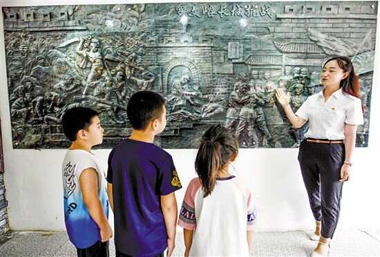 8月15日,工作人员在河北省遵化市侯家寨乡罗文峪长城抗战陈列馆向前来参观的孩子们讲述历史。