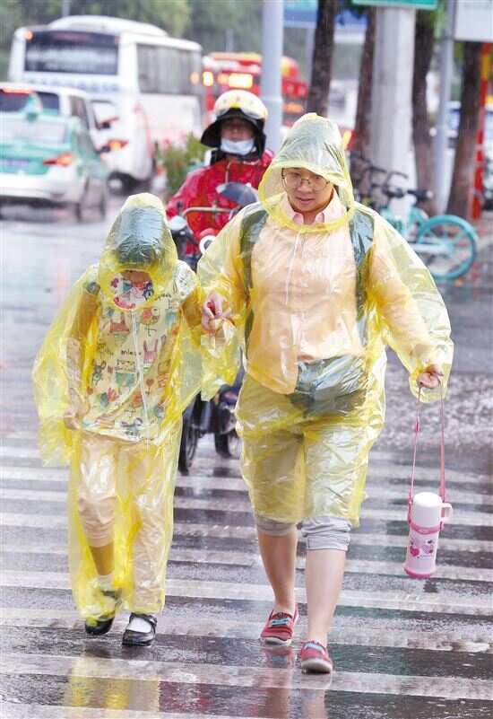 ■天河区棠下一路口处,路人身穿雨衣,快速前行。 新快报见习记者 邓迪/摄 |
