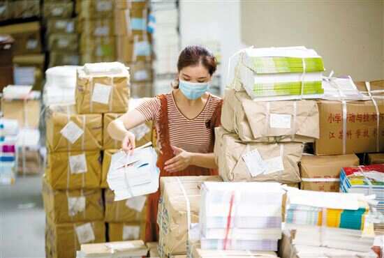 8月20日,工作人员在江苏省泰州市新华书店仓库整理清点教材,准备送往各学校。新学期临近,各地抓紧做好中小学生教材的分类和发放工作,为开学做好准备。新华社发