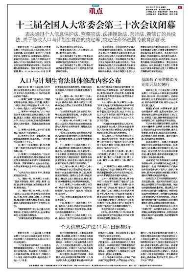 表决通过个人信息保护法、监察官法、法律援助法、医师法、新修订的兵役法、关于修改人口与计划生育法的决定等,决定任命怀进鹏为教育部部长 据新华社电 十三届全国人大常委会第三十次会议20日上午在