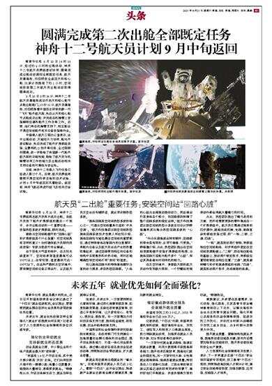圆满完成第二次出舱全部既定任务 神舟十二号航天员计划9月中旬返回