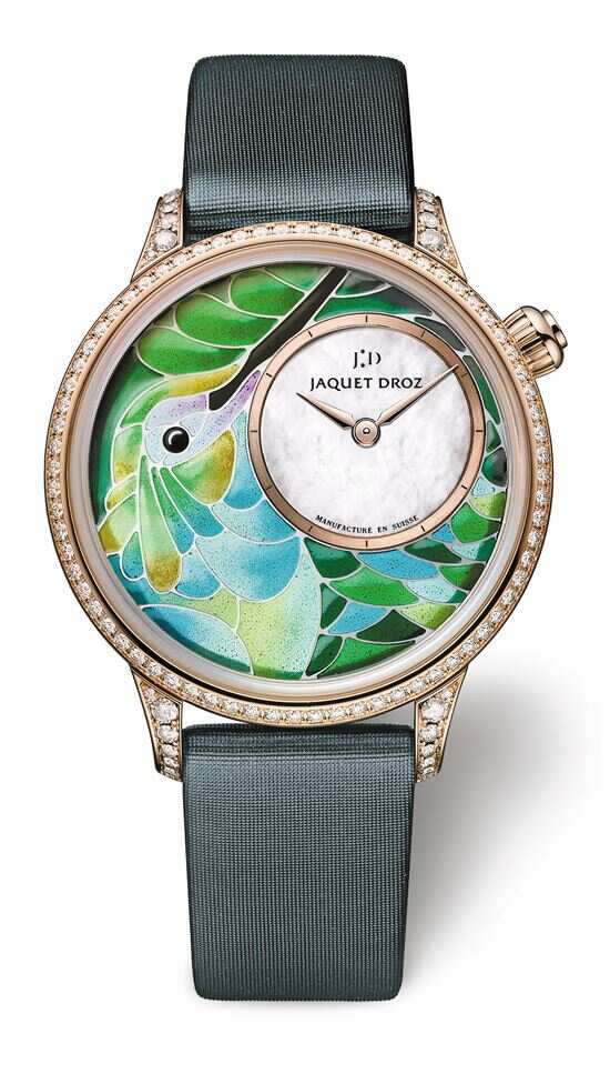 雅克德罗日前推出全新空窗珐琅蜂鸟时分小针盘腕表。这款新作色彩斑斓,主角是一只蜂鸟,雅克德罗工匠大师以精妙手法赋予了其层次分明递进的绿色色调。时分小针盘则幻化为挥洒创意的画布,并将时分表盘设于2时位置,为施展空窗珐琅的精湛技艺提供了无拘无束的空间。此款新作全球仅限量发行8枚,表圈与表耳镶嵌100颗钻石,表壳直径35毫米,并配备绿色手工织缎表带。