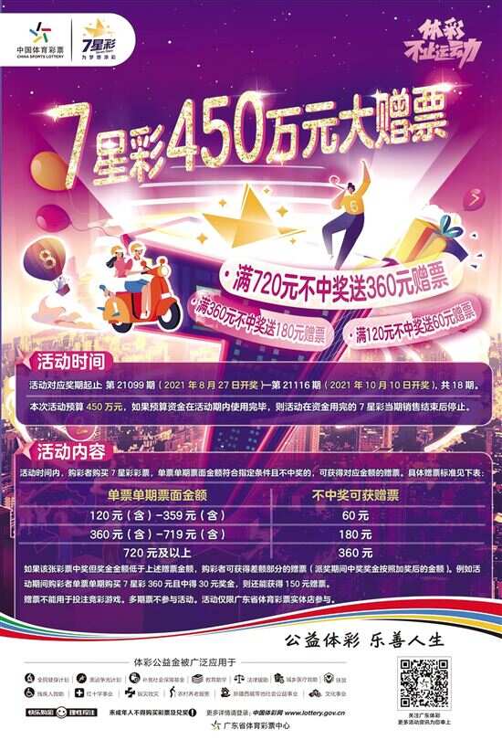 如赠票资金在活动期内使用完毕,则在资金用完的当期销售结束后停止 新快报讯 记者陆妍思 通讯员粤体彩报道 7星彩5000万元派奖即将展开,“一等奖单注最高可中1000万”“二等奖奖金翻倍”“固定奖奖金增加50%”,众多亮点让购彩者跃跃欲试。为庆祝7星彩派奖这一盛事,广东体彩开展450万元大赠票活动,与派奖一起让广大购彩者享受双重惊喜! 赠票活动在7星彩第21099期(8月27日开奖)—第21116期(10月10日开奖)开展,共18期。购彩者购买7星彩彩票,单票单期票面金额符合指定条件且不中奖的,可获得对应金额的赠票。 赠票标准如下:单票单期票面金额120元(含)~359元(含),不中奖可获赠票60元;单票单期票面金额360元(含)~719元(含),不中奖可获赠票180元;单票单期票面金额720元及以上,不中奖可获赠票360元。如果该张彩票中奖但奖金金额低于上述赠票金额,购彩者可获得差额部分的赠票(派奖期间中奖奖金按照加奖后的金额)。例如活动期间购彩者单票单期购买7星彩360元且中得30元奖金,则还能获得150元赠票。活动仅限广东省内体彩实体店参与,多期票不参与活动。 本次活动安排赠票资金为450万元,如果赠票资金在上述活动期内使用完毕,则活动在资金用完的7星彩当期销售结束后停止。 据介绍,自去年10月新规则上市后,7星彩受到了广大购彩者的热烈欢迎。在今年6月,惠州一幸运购彩者中得7星彩大奖1亿元,是7星彩史上首个亿元大奖,更是进一步引起了大家的关注。这次7星彩5000万元派奖和450万元赠票活动,相信会为这个热烈的夏日购彩季再添一份热情。广东体彩提醒,因为活动火爆,450万元赠票是有可能提前赠送完毕的,欢迎广大购彩者光临广东体彩上万家实体店参与投注。 相关 7星彩派奖和赠票怎么玩 7星彩赠票活动开始时间与派奖一样,并且可与派奖同时叠加,一次投注,双重快乐!那么肯定不少购彩者会问,结合这两个活动,怎样投注更好玩呢?这里小编就要为大家推荐,7星彩最近刚上线的投注方式——前区全组合投注啦! 前区全组合投注实质是一种前区复式投注,在0-9中选择6个数字(可包含重复数字),将选择的6位数字的所有排列组合均进行投注。例如前区选择123456进行全组合购买,则购买了由1、2、3、4、5、6这6个数字构成的所有排列组合,总注数为720注。它的最大优点是解决了7星彩选号和兑奖需要对位的问题,化繁为简,大大简化了购彩过程,十分适合对乐透数字游戏有一定了解的购彩者。 按照重复数字的不同形态,前区全组合投注可分为10种不同的数字形态。其中三同二同、两组二同、二同的基本投注金额刚好达到本次赠票活动里三档的门槛,是参加赠票活动的绝佳之选!尤其是二同、两组二同,它们的形态概率(即该形态包含的所有组合数在100万种组合中出现的概率)是前区全组合投注中最高的两种,是冲击大奖的一大利器。