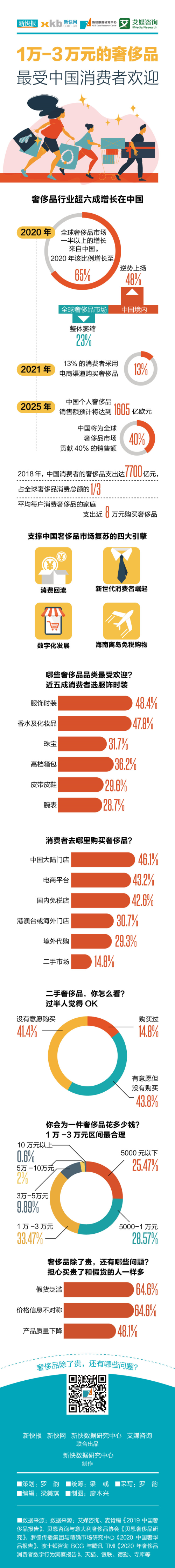 超两成消费者贷款购买奢侈品 对于普遍缺乏财富积累的年轻消费者而言,奢侈品的超前、低龄消费必然需要面对“钱从哪里来”的问题。 根据艾媒咨询提供的2021Q1数据,在单价方面,中国大多数消费者单个奢侈品支出金额为1万至3万元,占比为34.47%。而在5000元至1万元单价区间内,消费者购买奢侈品金额的比值相差不大。此外,25.47%的消费者买过5000元以下的奢侈品,仅不到一成的消费者愿意购买价格在3万-5万元间的奢侈品,而愿意购买单价为5万元以上奢侈品的消费者则更少。 频率方面, 24.3%的消费者经常购买奢侈品,51.7%的消费者表示会偶尔购买奢侈品,表示只购买过一次奢侈品的消费者占比7.3%,表示从不购买奢侈品的消费者人数占比为16.7%。 品类方面,48.4%的消费者购买的奢侈品为服饰时装,同时也有47.8%的消费者购买的品类为香水及化妆品。而珠宝(37.1%)、高档箱包(36.2%)、皮带/皮鞋(29.6%)等也是消费者购买的品类之一。 资金来源方面, 70.1%消费者购买奢侈品的资金来源于个人可支配收入,22.3%消费者来源于贷款,同时还有6.4%的消费者资金来源于父母/配偶。 针对奢侈品最主要的市场白领群体,中国26.2%白领群体经常购买奢侈品;53%的白领群体偶尔购买;只买过一次奢侈品的白领群体占比6.4%;而没有买过奢侈品的白领群体比例在14.4%。 在整个奢侈品市场的火热发展下,二手奢侈品市场交易流通也呈现良好的态势。数据显示,2020年中国二手电商行业交易规模已达3745.5亿元。数据显示,2021Q1中国43.8%消费者有意愿购买二手奢侈品,41.4%的消费者表示没有意愿购买二手奢侈品,14.8%的消费者则表示有购买过二手奢侈品。 分析师指出,随着社会经济和个人生活水平的提升,奢侈品消费必将迎来增长。但是随着奢侈品消费在个人总消费所占的比例越来越高,值得注意的是,有一部分消费者通过贷款购买奢侈品,这就需要培养健康的消费观念,理性看待奢侈品。此外,随着消费理念的不断转变,越来越多消费者接受二手奢侈品,二手奢侈品消费群体从高收入人群逐渐向大众化转移,普通白领以及大学生也成为二手奢侈品的消费群体。 ■数据来源:艾媒咨询、麦肯锡《2019中国奢侈品报告》、贝恩咨询与意大利奢侈品协会《贝恩奢侈品研究》、罗德传播集团与精确市场研究中心《2020中国奢华品报告》、波士顿咨询BCG与腾讯TMI《2020年奢侈品消费者数字行为洞察报告》、天猫、银联、德勤、寺库等。