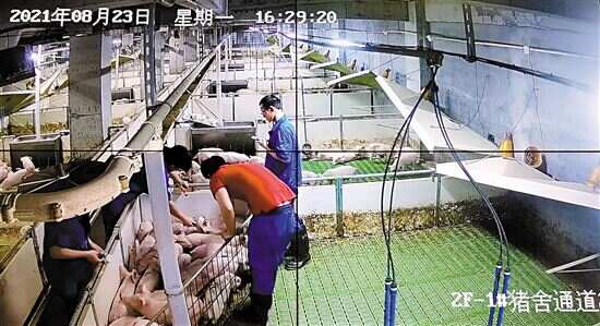 ■金农公司的员工在养猪场查看小猪的生长情况。 |