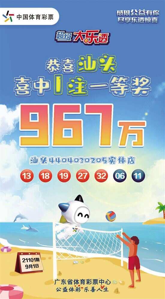 新快报讯 记者陆妍思报道 9月1日,体彩超级大乐透第21101期开奖,当期全国中出6注一等奖,其中广东汕头一张10元单式票中出1注967万元基本投注一等奖。 6注头奖1注追加 大乐透第21101期的中奖号码为:前区“13、18、19、27、32”;后区“06、11”。前区大小比4∶1,奇偶比3∶2,开出一组连号“18、19”,“18”“13”“32”分别为遗漏26期、19期、10期开出的冷号,“19”“27”为隔期跳号;后区开出一小一大的偶奇组合,其中“06”此前遗漏10期。 本期全国共开出6注一等奖,其中1注为1741万元(含774万元追加奖金)追加投注一等奖,落于四川成都;5注为967万元基本投注一等奖,落于上海市宝山区、安徽六安、河南濮阳、广东汕头和重庆市万州区。 可惜没有追加投注 据核查,花落广东汕头的一等奖,出自龙祥街道夏桂埔浦江路3号之三的4404030205体彩实体店,中奖的彩票是一张10元5注单式票,该中奖彩票投注的第5注号码与本期开奖号码完全一致。 追加投注是大乐透独有的投注方式,在2元基本投注的基础上,多花1元进行追加投注,可多得80%的浮动奖奖金。对比可见,由于没有采用追加投注,汕头中奖者在单注一等奖方面少拿了774万元追加奖金,从而错失中得千万巨奖的机会。 奖池仍达10.43亿 二等奖开出101注,每注奖金10.58万元;其中39注采用追加投注,每注多得奖金8.46万元。追加后,二等奖单注总奖金19.04万元。 当期全国销量为2.81亿元,为国家筹集彩票公益金1.01亿元。奖池方面,本期开奖结束后,10.43亿元滚存至9月4日(周六)开奖的第21102期。