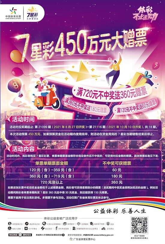 同期广东湛江一票独中2注500万,惜未获派奖 新快报讯 记者陆妍思报道 7星彩5000万元派奖第六期,1000万元单注封顶一等奖终于现身!9月5日晚的体彩7星彩第21103期开奖中,一等奖一举爆出3注,但只有陕西的1注中奖彩票单票投注金额在10元以上能获得派奖,这位幸运儿也收获总奖金1000万元,成为7星彩5000万元派奖以来首位加料一等奖得主。 开奖回放 湛江2注头奖错失派奖 7星彩第21103期的中奖号码为:前区“5 5 6 9 9 8”+后区“3”。本期7星彩全国销量为3229万元,为国家筹集彩票公益金1194万元。 本期7星彩开出3注一等奖,其中1注花落陕西省渭南市,中奖彩票为一张10元单式机选票,根据7星彩派奖活动规则,单票投注金额10元及以上即可参与活动,因此这位中奖幸运儿独揽了本期派奖奖金500万元,单注收获奖金1000万元。这注1000万元一等奖,是7星彩派奖期间首次中出单注封顶大奖。 此外,当期另外2注500万元一等奖均落户广东省湛江市,可惜中奖彩票投注金额未满10元,与派奖奖金擦肩而过,单票总奖金1000万元,若该中奖彩票投注金额满了10元“门槛”,那么该位中奖者将可获得2000万元奖金。 本期开奖结束后,7星彩奖池2.51亿元,一等奖派奖奖金剩余1000万元,二等奖派奖奖金剩余155万元,固定奖派奖奖金剩余983万元。 好彩提醒 掌握两要点可轻松参与 可见,目前7星彩派奖仍是“弹药十足”,看到这里,还没有参与派奖活动的小伙伴,是不是已经有点按捺不住了?其实不管是投注7星彩还是参加派奖都非常简单,只需掌握以下两点,就算你是“购彩新手”也能轻松参与: 一、 7星彩投注方式——7星彩1注号码由7位数组成,从000000-999999中选取1个6位数作为前区,从0-14中选取1个数作为后区,这样就共同组成了1注号码,如果你想选的数字超过7个,还可以选择进行复式投注,7个位置上的数都可以选择多个,从而排列组成多注号码。至于要选什么数,你可以打票时直接机选,也可以从生日日期、车牌号等常见数字找到灵感。 二、单票金额满10元——学会了如何投注7星彩,就该了解派奖规则了,为了让每个人都能轻松参与,让福利普惠大众,本次派奖活动只有一个“门槛”,即单票金额满10元。这个条件非常容易达成,7星彩1注号码2元钱,也就是说,你只需要单票满5注号码就可以,直接选5注、1注号码打五倍,或采用复式投注等多种方式供你选择。 此次湛江的中奖者就是因为没有买满10元,白白错失奖金翻倍的机会。 额外惊喜 广东升级活动为幸运添彩 除了全国范围的大派奖活动,各地也接着东风送福利,陆续推出各种惊喜活动,为幸运再次升级,如在广东就同期开展了给力的450万元大赠票活动。 赠票活动预计持续至第21116期(10月10日开奖)。购彩者购买7星彩彩票,单票单期票面金额符合指定条件且不中奖的,可获得对应金额的赠票。 赠票标准如下:单票单期票面金额120元(含)~359元(含),不中奖可获赠票60元;单票单期票面金额360元(含)~719元(含),不中奖可获赠票180元;单票单期票面金额720元及以上,不中奖可获赠票360元。如果该张彩票中奖但奖金金额低于上述赠票金额,购彩者可获得差额部分的赠票(派奖期间中奖奖金按照加奖后的金额)。例如活动期间购彩者单票单期购买7星彩360元且中得30元奖金,则还能获得150元赠票。活动仅限广东省内体彩实体店参与,多期票不参与活动。 本次活动安排赠票资金为450万元,如果赠票资金在上述活动期内使用完毕,则活动在资金用完的7星彩当期销售结束后停止。