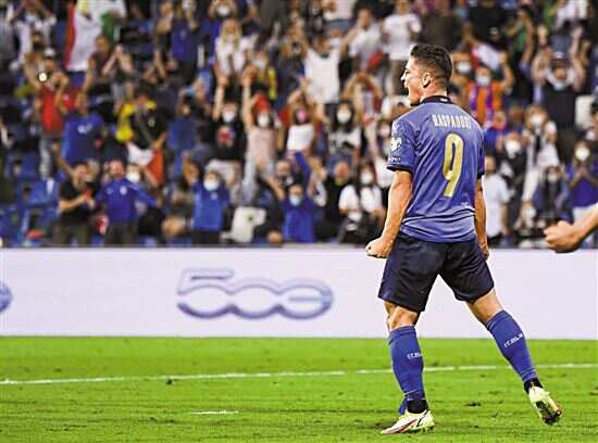 ■意大利队球员拉斯帕多里在进球后庆祝。新华社发 |