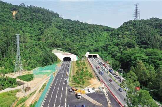 ■16日13时,华南快速路石门堂山隧道扩建工程将建成通车,较工期计划提前半年,原石门堂山隧道改为双洞单向(北行)通行,与新隧道(南行)组成双向八车道。新快报记者 毕志毅/摄