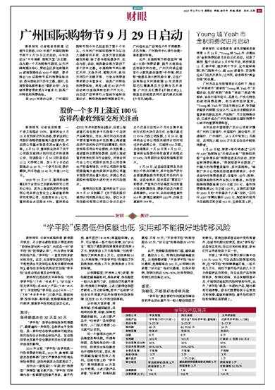 新快报讯 记者刘威魁报道 新学期开学后,不少家长都收到孩子带回来的“致学生家长的一封信”,内容是一份“学平险”的“投保确认单”。作为学生专属的保险产品,“学平险”一直受到很多家长的关注。近日,北京银保监局印发《关于规范学生平安保险业务有关事项的通知》,督导在京保险机构切实加强“学平险”业务合规运营及合作管理。 新快报记者选取太平洋保险“任我学学平险”(下称“任我学”)、“状元宝*阳光学平险(基础版)”产品(下称“状元宝”)、平安财险“学平险2020(计划一)”(下称“平安学平险”)三款产品,围绕保费、投保年龄、等待期、免赔额等维度进行测评,探索学平险到底应该怎么买。 测评:等待期基本在30天至90天 “学平险”是学生群体投保范围最广、最普遍的一种保险,全称学生平安保险,是一类针对在校学生群体可能发生的风险而设计的商业保险产品,旨在降低学生因意外安全事故的发生对家庭经济造成的影响。 2015年以前,“学平险”由学校统一代收保费进行购买。2015年,教育部、国家发改委等部门发文严禁学校代收商业保险保费后,该险种就改为自愿购买了。 而作为一款短期(一年期)的“消费型”“保障型”基本款产品,“学平险”的保障内容一般都要包括意外身故、意外伤残、意外医疗(含住院)等基础保障。此外,可以增添一些个性化保障,如“状元宝”增加了感染新冠病毒身故或残疾3万元、疾病身故3万元等保障;“任我学”增加了疾病身故3万元、住院津贴50元/天等保障;“平安学平险”则增加了传染病身故/伤残3万元、疾病身故3万元的保障。 从保障额度(即理赔上限)来看,保险额度越高越有利。具体来看,保险额度一般分为意外门诊、住院治疗和意外身故/伤残等三种额度,上述三款得住院医疗都有6万元的保障。其中,“任我学”不包含另外两款产品所保障的传染病保障,但包含50元/天的住院津贴。 从价格方面来看,同等保额,价格越低越好。花相同的保费,保额、保障范围越多越划。上述三款产品中,“任我学”是保费较低的,入门版只需要100元就可以买到。 另一个值得关注的产品维度是等待期。所谓等待期,是指投保后的一段时间,即使发生保险事故也不理赔的约定。因此,等待期越短越对投保人有利。目前市面上的“学平险”等待期都在30天至90天范围。上述三款产品来看,“任我学”的等待期最短,只有30天;“平安学平险”的等待期为60天;“状元宝”的等待期为60/90天。 此外,免赔额是理赔的门槛,越低越好,最好为0元;报销比例则越高越实用。从免赔额来看,“平安学平险”性价比最低,免赔额高达300元。从报销比例来看,“状元宝”性价比最高,社保未报销,报销比例达50%-90%;社保报销后,报销比例也高达90%。 感受:保额低,不能很好地转移风险 “学平险”最主要的作用就是保障在校的学生发生意外与一般小额住院医疗的责任。因病住院或者运动中受伤等意外,在读书时期比较常见,因此“学平险”还是很实用的。而且它的价格便宜,家长们可以考虑给孩子买一份。 市面上“学平险”保费大部分集中在100元-200元,可以说是比较便宜的险种。但“学平险”的保障普遍不高,一般只有几万元,相对于意外险产品的几十万元保额来说非常低。而且这类产品报销限制多,报销比例低,而且保额明显不足,不能很好地起到风险转移的作用。此外,“学平险”都是一年期的产品,随时都有可能停售。家长们想要给孩子全面充足的保障,基础的重疾险、意外险和医疗险的保障还是要跟上。