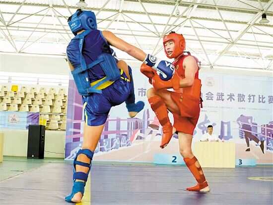 新快报讯 记者杨英杰报道 9月14日,东莞市第十届运动会武术散打比赛在长安镇上沙体育馆举行。散打设有男子甲组团体(52公斤级、60公斤级)、男子乙组团体(48公斤级、56公斤级、60公斤级、60公斤以上级)两个项目。据了解,武术散打项目共设置了两枚金牌,经过激烈的角逐,最终,长安镇武术队表现强势,在比赛中荣获男子甲组冠军和男子乙组冠军,包揽该项目的两枚金牌,且位列团体总分第一名。 现场赛况激烈,选手们“远则拳打脚踢,近则贴身快摔”的技巧打法,充分展示了中国武术的精湛技艺。据了解,武术散打是由传统武术技击形式发展而来,以踢、打、摔和防守技法为主要方法,进行徒手格斗的一项现代体育竞技运动项目。