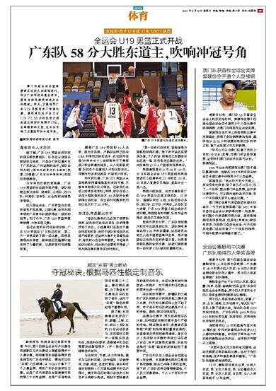 全运会U19男篮正式开战 全运会·男子U19组 广东129∶71陕西 第十四届全运会篮球赛事正在如火如荼地进行,作为广东军团的重点项目,篮球自然是颇受球迷关注的领域。昨天,卫冕冠军广