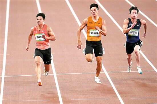 ■广东队选手苏炳添(左)和浙江队选手谢震业(中)、四川队选手何宇鸿在比赛中。新华社发 |