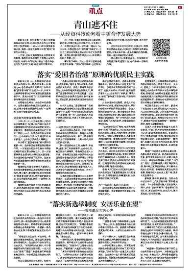 ——香港基层市民心声 据新华社电 2021年香港特别行政区选举委员会界别分组一般选举日前成功举行,新一届选委会顺利产生。很多香港基层市民表示,期待落实新选举制度给香港社会带来新气象,希望新