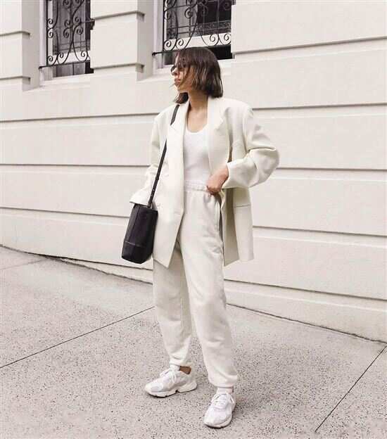 西装配慢跑裤,锥形款裤型更适合大多数人,加上好的垂坠感会更加分,堆满褶皱的裤腿容易将整个人拉矮,因此裤长把握在能把脚踝露出来就最佳了。 |