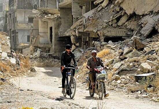 9月23日,在叙利亚首都大马士革城南的巴勒斯坦难民聚居区——耶尔穆克难民营,骑车人在废墟间骑行。 耶尔穆克难民营自2015年4月被极端组织“伊斯兰国”占领,此后三年间成为叙利亚政府军与极端组织激烈交火的战场。如今战火虽已平息,但战争造成的巨大破坏仍随处可见。 新华社发