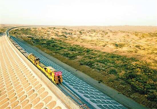 据新华社电 27日上午,随着最后两条钢轨在道床上铺设完成,作为环塔克拉玛干沙漠铁路“最后一公里”的和若铁路全线铺轨贯通,为2022年开通运营奠定坚实基础。 和若铁路为国家重点铁路建设项目,线路全长825.476公里,2018年12月开工建设,连通南疆和田地区和田市与巴音郭楞蒙古自治州若羌县。完成铺轨的和若铁路与现有格库铁路、喀和铁路、南疆铁路连通,环绕塔克拉玛干沙漠一周,构成世界首条环沙漠铁路线。 据介绍,和若铁路穿行塔克拉玛干沙漠南缘,近630公里为人迹罕至的沙漠、戈壁地段,全线风沙段落分布长度达538公里,占线路长度65%,主要风季长达7个月。 新疆和若铁路有限责任公司董事长王尽忠表示,和若铁路采用风沙防护工程与铁路本体同步建设模式,共修建草方格5000万平方米,种植苗木1300万株,工程防沙与植物防沙相结合段落285.7公里,工程防沙段落62.7公里,风沙桥段落49.738公里。目前,沙漠区植物长势较好,“绿色长廊”初现规模。 作为国家中长期铁路网规划中西部地区重要区域路网干线,和若铁路是构建我国西部腹地向南亚、中西亚国际大通道的一项重要举措,预计2022年6月开通运行。