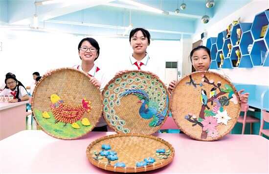 ▲沙步小学手工兴趣小组以旧簸箕为主题的创意作品。 |