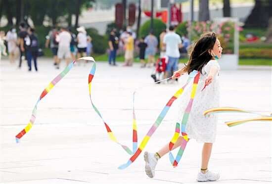 ■花城广场,一名小女孩手拿彩带在广场上奔跑玩耍。新快报记者 夏世焱/摄 |