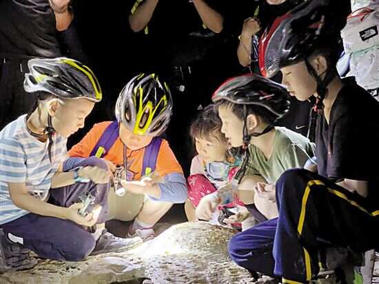 ■溶洞探险中,孩子们正在认真观察一处天然形成的钟乳石“聚宝盆”。 |