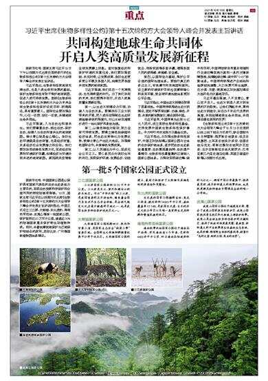 据新华社电 中国国家公园是以保护具有国家代表性的自然生态系统为主要目的,实现自然资源科学保护和合理利用的特定陆域或海域。12日,国家主席习近平在以视频方式出席《生物多样性公约》第十五次缔约方大会