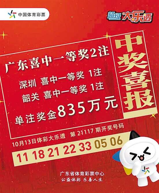 第21117期大乐透全国共开出8注头奖 新快报讯 记者陆妍思报道 10月13日,大乐透第21117期开奖,当期广东中出2注835万元基本投注一等奖,分落深圳、韶关。 大乐透第21117期的中奖号码为:前区“11、18、21、22、33”;后区 “05、06”。前区号码大小比4:1,奇偶比3:2,其中最大号码“33”为遗漏12期开出的冷号,开出一组连号“21、22”,同时开出一组同尾码“11、21”;后区开出一组小号连号组合,其中“05”为遗漏13期开出的冷号,“06”为隔期开出的跳号。 本期全国共开出8注一等奖,其中1注1504万元(含668万元追加奖金)追加一等奖,花落新疆巴州;还有7注835万元基本投注一等奖,分落河北廊坊、江苏南通、浙江金华、河南信阳、湖北武汉、广东深圳和广东韶关各1注。 据核查,花落深圳的基本一等奖,出自宝安区大浪街道元芬村138栋-2号的4402026667体彩实体店,中奖彩票是一张12元“6+2”复式票,单票总揽奖金837万元;花落韶关的基本一等奖,出自沙洲尾江晖花园E栋10号铺4406006215体彩实体店,中奖彩票是一张270元“前区3胆10拖+后区1胆3拖”的胆拖票,单票总揽奖金854万元。 追加投注是大乐透独有的投注方式,在2元基本投注的基础上,多花1元进行追加投注,可多得80%的浮动奖奖金。对比可见,由于没有采用追加投注,本期来自深圳、韶关的中奖者,在单注一等奖方面比新疆中奖者少拿668万元追加奖金。 同期二等奖开出169注,每注奖金6.19万余元;其中51注采用追加投注,每注多得奖金4.95万余元。追加后,二等奖单注总奖金11.14万元。 本期全国销量为2.79亿元,为国家筹集彩票公益金1亿余元。奖池方面,本期开奖结束后,11.24亿余元滚存至10月16日(周六)开奖的第21118期。